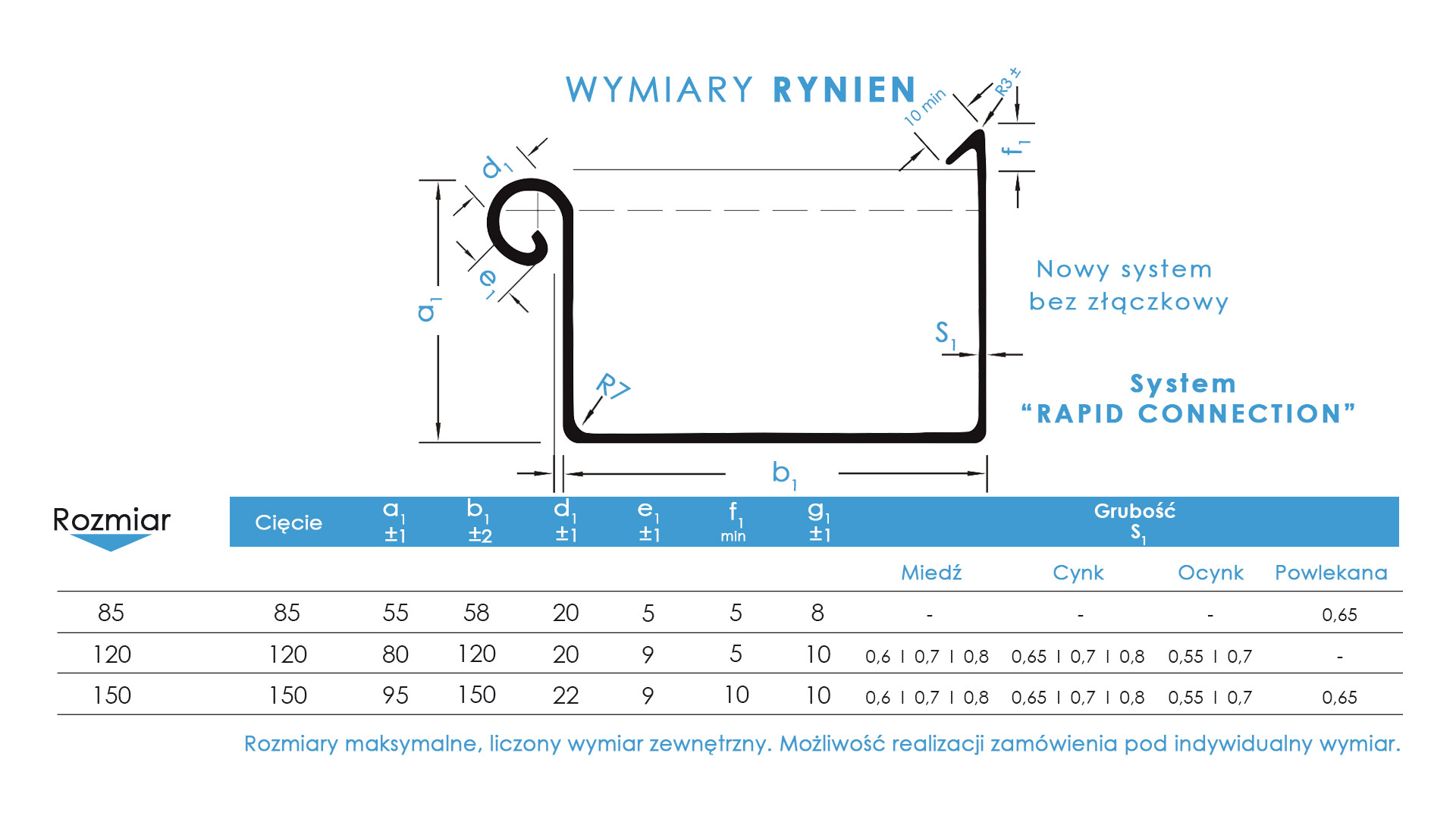 Rynny kwadratowe - wymiary Tabela wymiarów rynien kwadratowych w systemie Rapid Connection